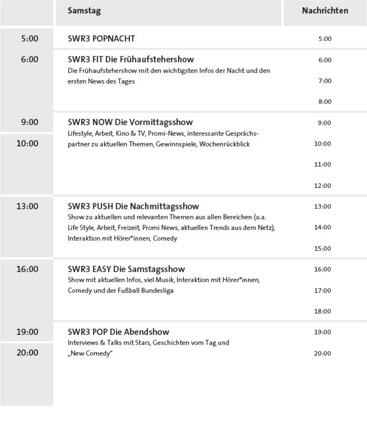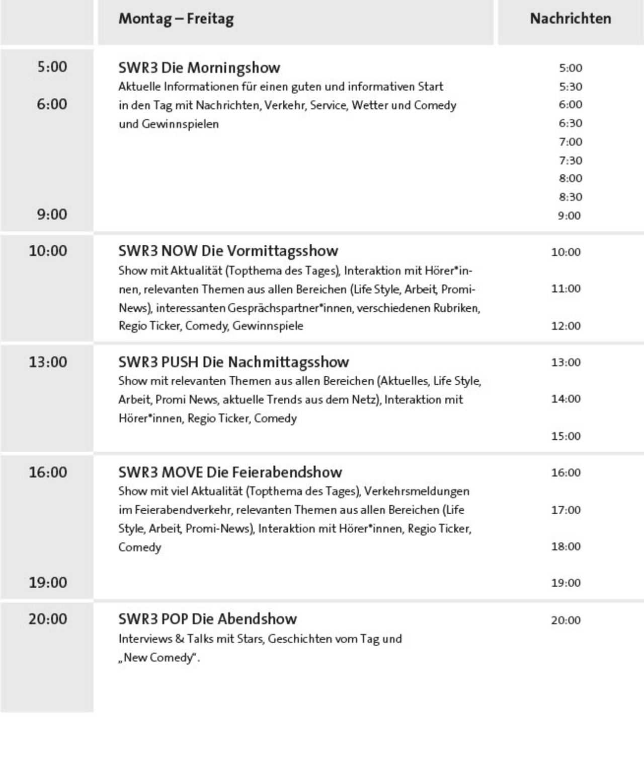 Die Popwelle begleitet ihre Hörer*innen mit dem besten Musikmix, den schnellsten Informationen aus SWR3-Land, Deutschland und der Welt, detailliertem Wetter- und Verkehrs-Service und kultiger Radio-Comedy.