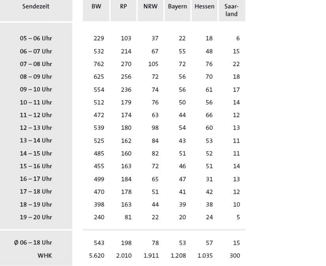 | 09–10 Uhr | 1.063 | 550 | 514 | 176 | 169 | 297 | 192 | 127 | 102 |