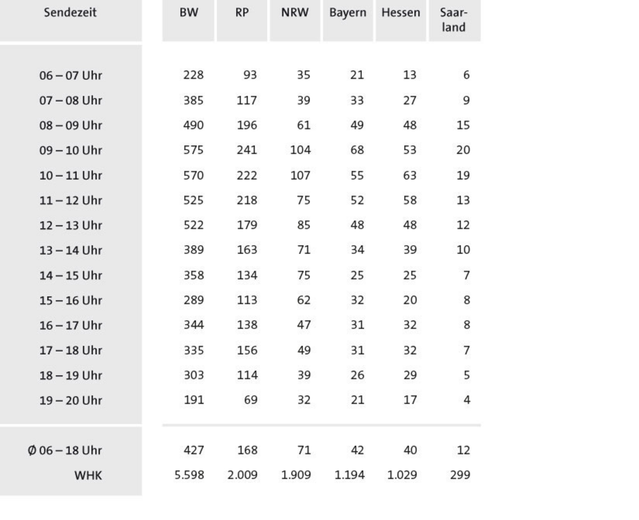 | 17–18 Uhr | 1.030 | 555 | 475 | 225 | 161 | 311 | 210 | 80 | 43 |