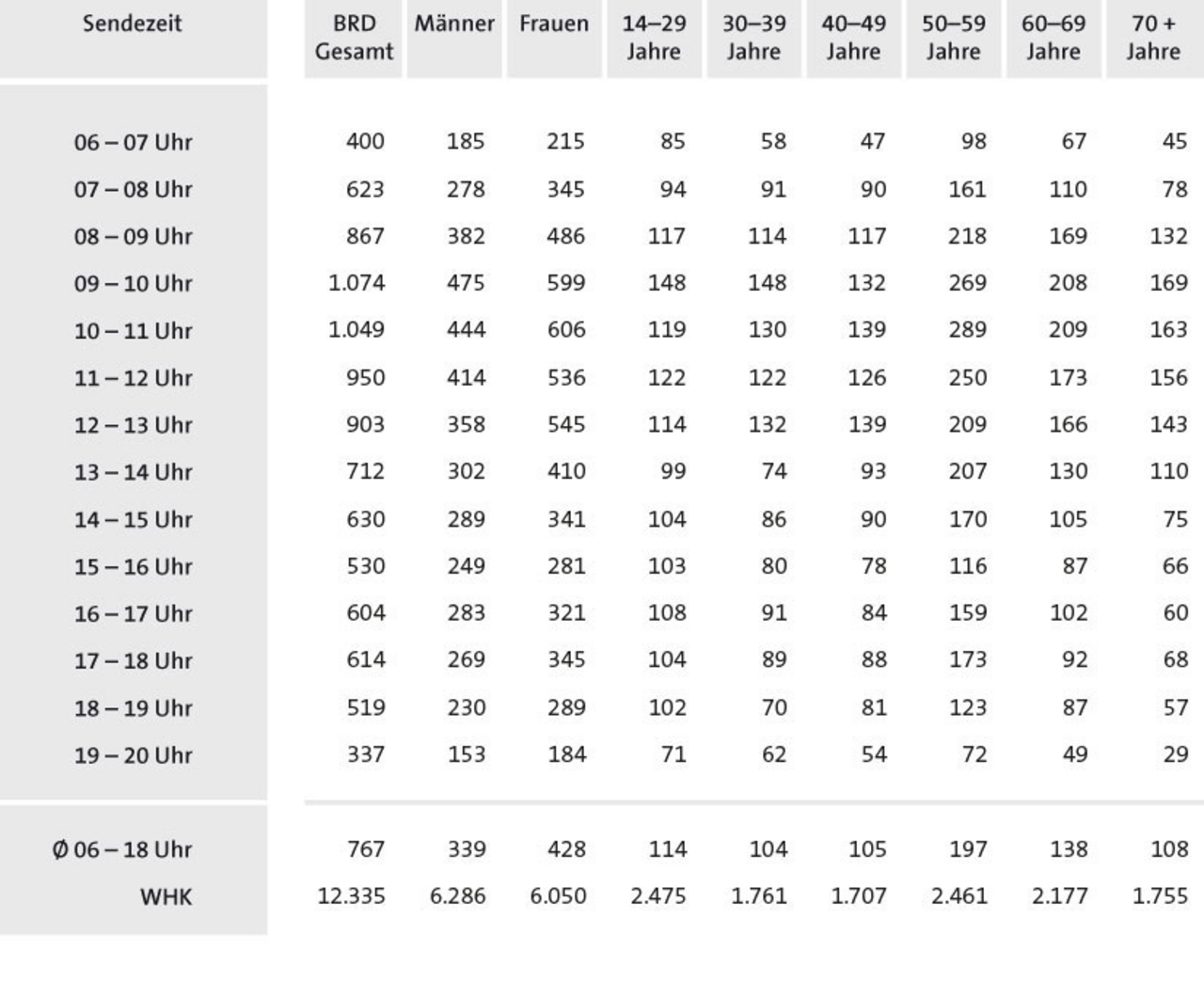 | Sendezeit | BRD Gesamt | Männer | Frauen | 10–29 Jahre | 30–39 Jahre | 40–49 Jahre | 50–59 Jahre | 60–69 Jahre | 70 + Jahre |