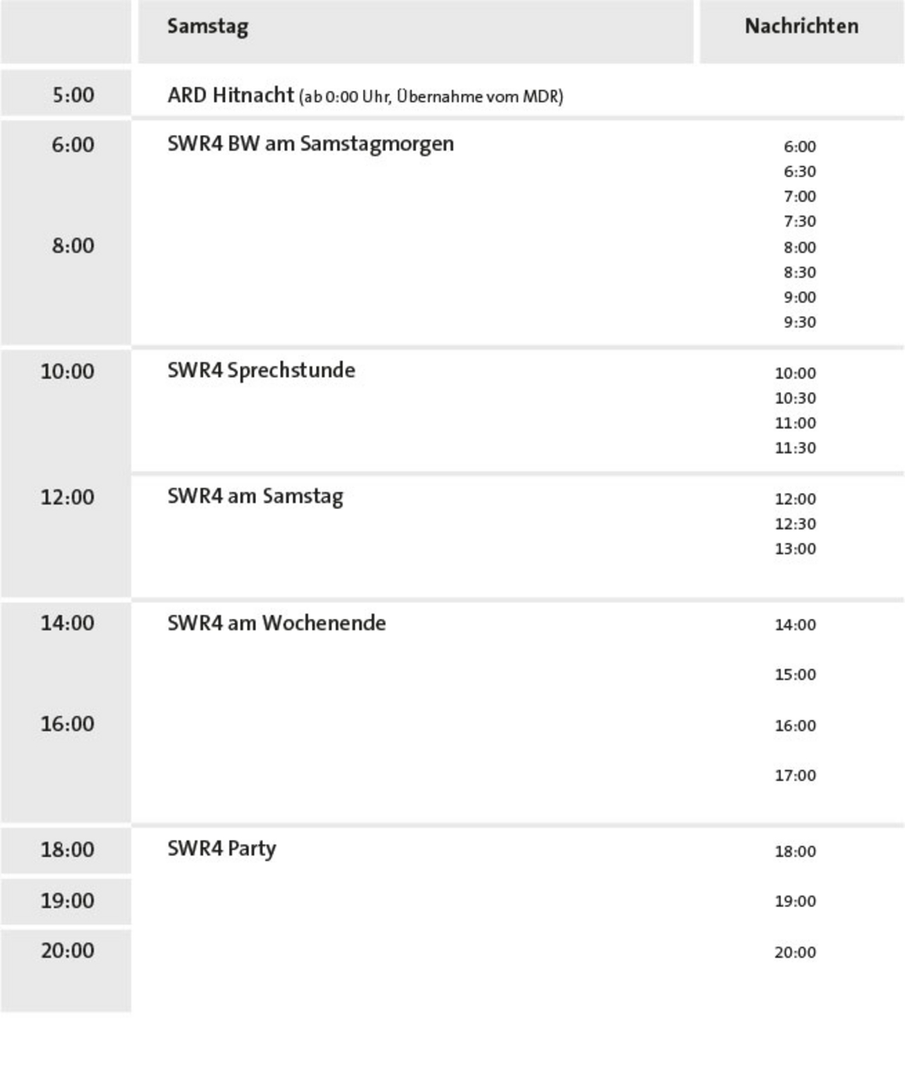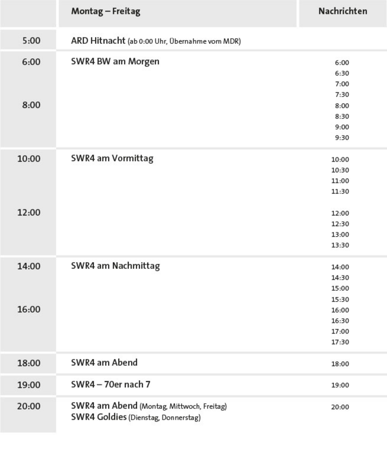 SWR4 Baden-Württemberg berichtet mit 96 regionalen Nachrichtenausgaben von Montag bis Freitag intensiv aus der Region und für die Region. Neben der richtigen Mischung aus regionaler Information, Servicetipps und Reportagen bietet SWR4 Baden-Württemberg gute Unterhaltung – mit dem schönsten Musikmix aus unvergesslichen 60er-Oldies, legendären 70er-Classics und den besten 80er-Hits.